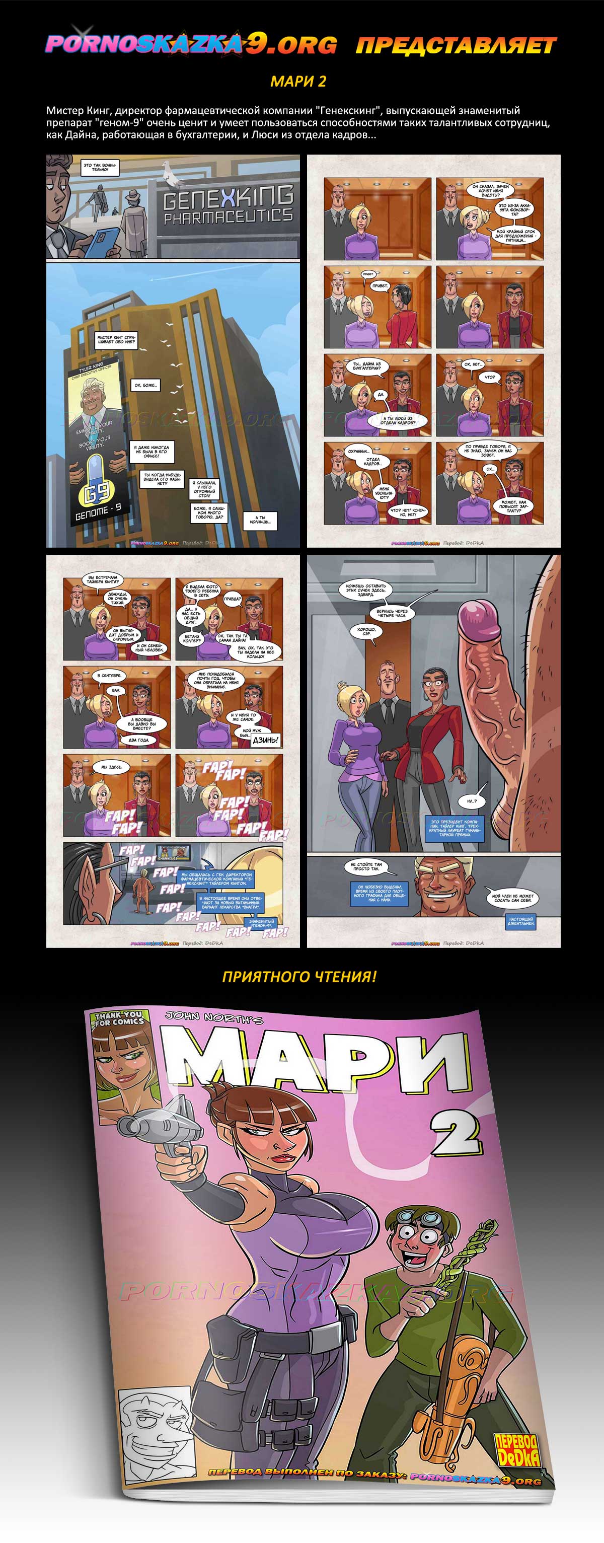 Порно комикс «Мари. Часть 2.» Мистер Кинг, директор фармацевтической компании «Генекскинг», выпускающей знаменитый препарат «геном-9» очень ценит и умеет пользоваться способностями таких талантливых сотрудниц, как Дайна, работающая в бухгалтерии, и Люси из отдела кадров…